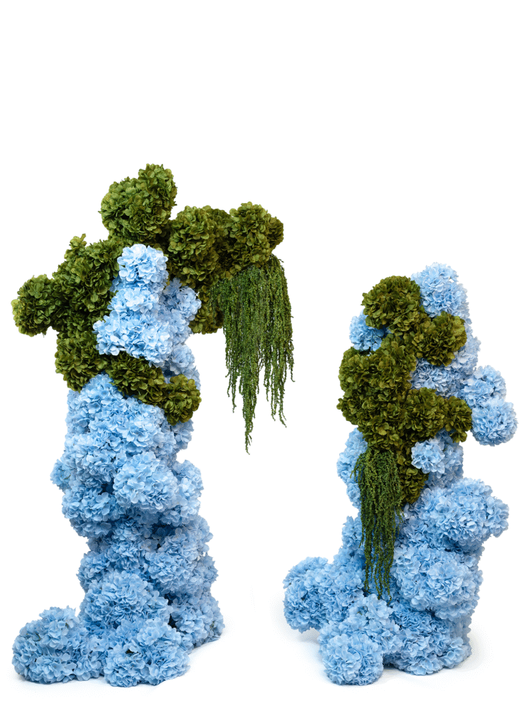 Playful modern clusters of blue hydrangeas with a sage green touch. A striking, contemporary statement for parties and bright weddings.