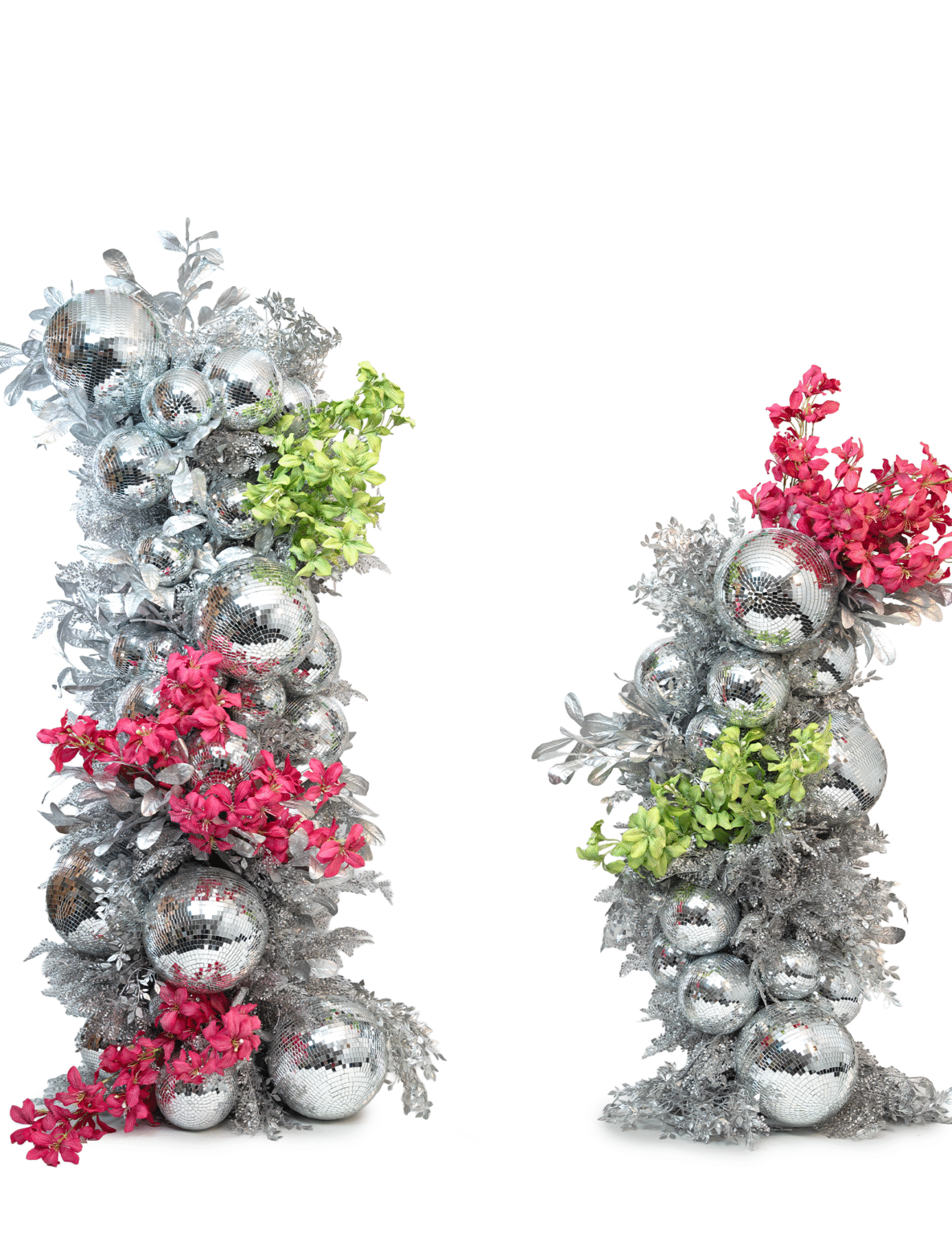 A cascade of silver disco balls + foliage that throws light in every direction. Turns entrances and dance floors into instant photo moments. These can be customised with colour for a really funky look.