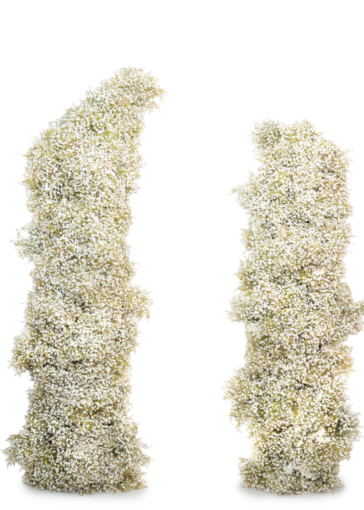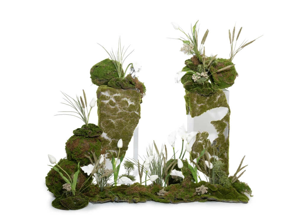 An artful terrain of moss, grasses and delicate whites arranged across 2 x perspex plinths. Calm, organic and gallery-ready ideal for product styling.