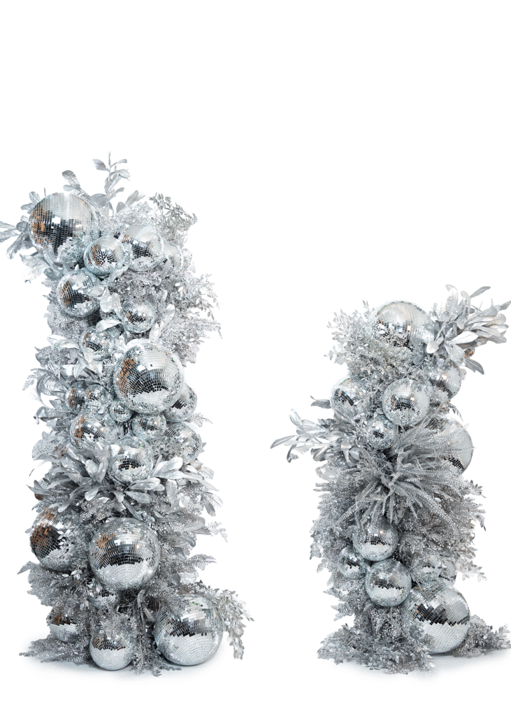 A cascade of silver disco balls + foliage that throws light in every direction. Turns entrances and dance floors into instant photo moments. These can be customised with colour for a rally funky look.