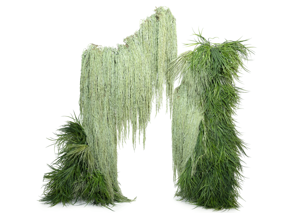 Textured grasses and hanging willow create a sculptural hanging installation curtain for an unforgettable backdrop or photo moment. Wild, different + sculptural.